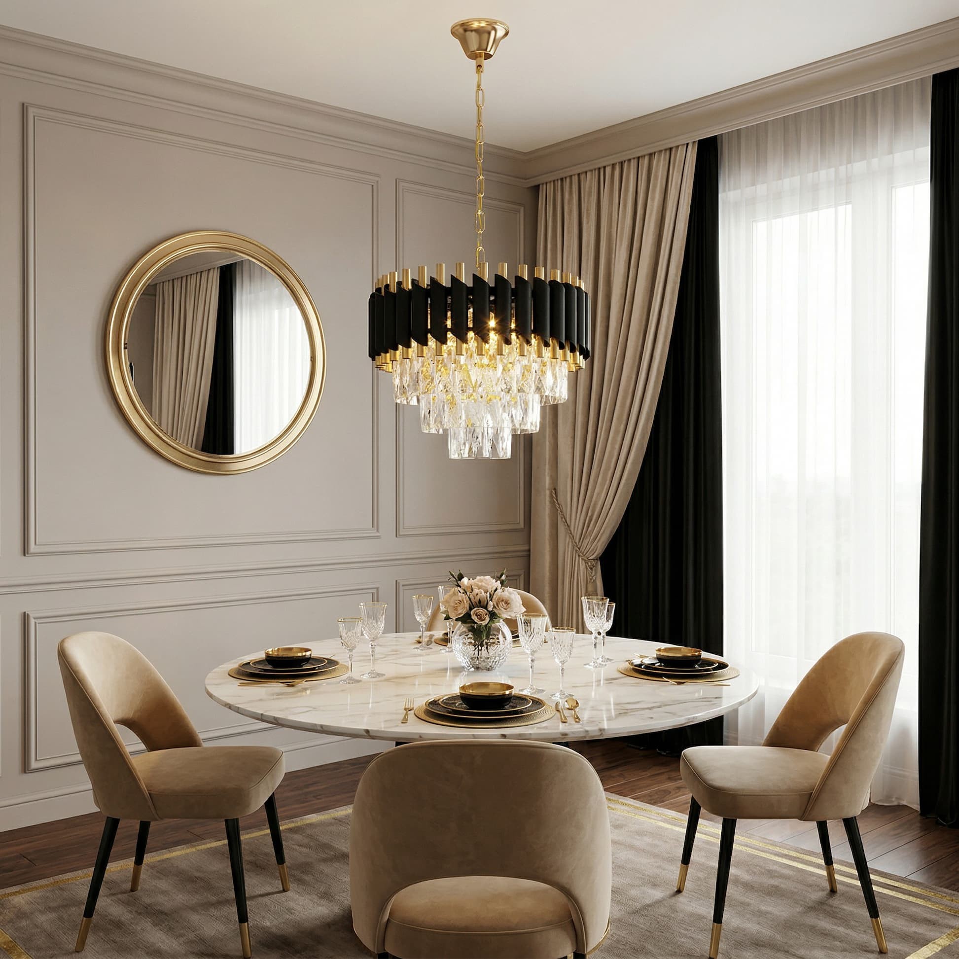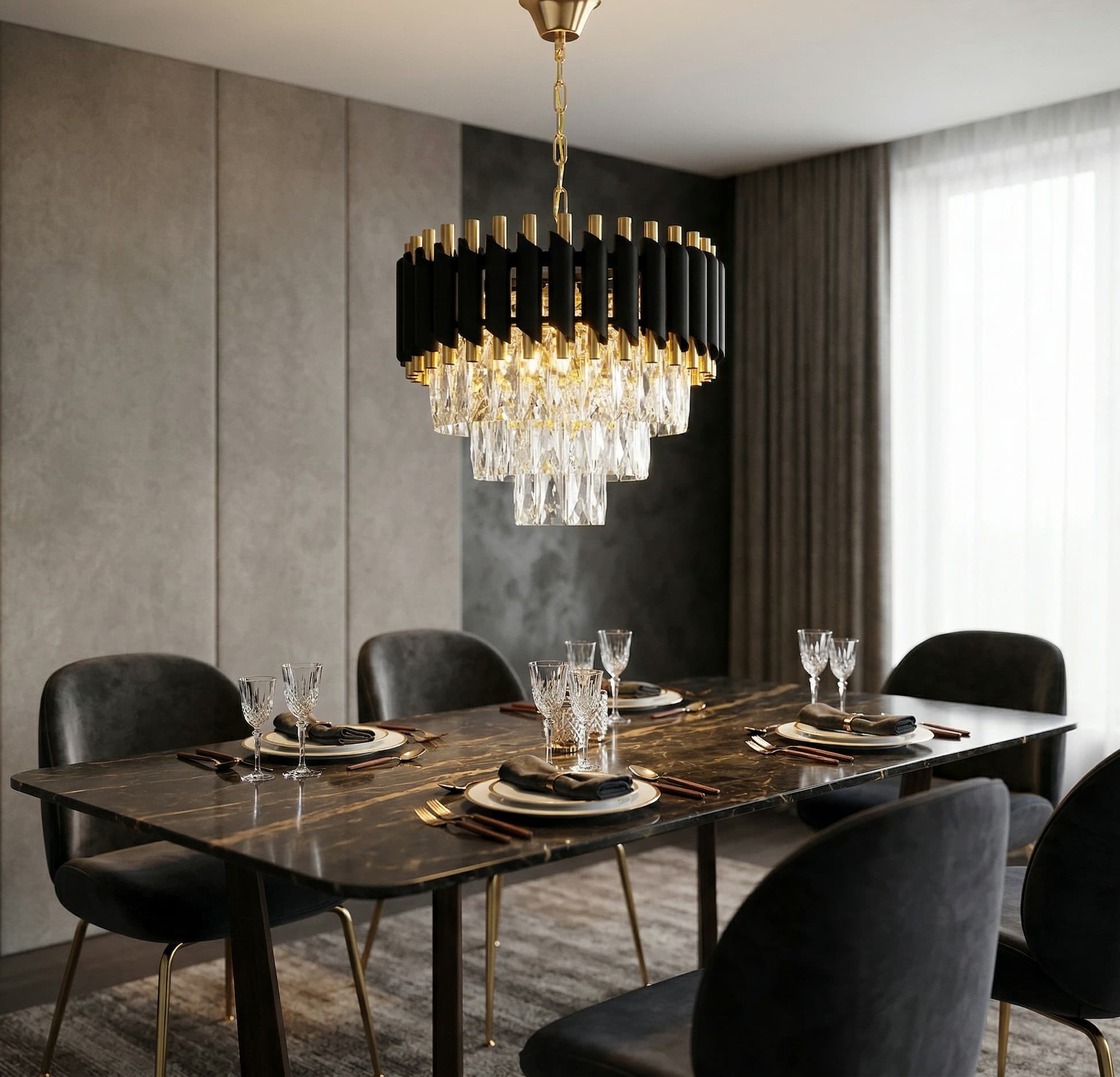 Tym, co wyróżnia kolekcję klasycznego oświetlenia Mazini, jest jej nadzwyczaj elegancka i gustowna kolorystyka, stonowana i dopasowana do materiałów, z jakich powstały poszczególne części produktów. Luksus widoczny pod każdą postacią zaakcentowano dodatkowo wpleceniem kryształowych wisiorów unoszących się subtelnie u dołu bryły. Górna kondygnacja zaś to połączenie prostych metalowych rurek w kolorze mosiądzu, które oplata kawalkada czarnych osłon o oryginalnie ściętych krawędziach. Żyrandol zaprojektowano na solidnej, metalowej bazie, od góry widocznej jako skrzyżowanie szerokich ramion w środku okręgu. Z centralnej części wychodzi natomiast w pełni tradycyjny łańcuch w złotym kolorze dopasowany do podsufitki. W środku lampy umieszczono sześć źródeł światła, które swą mocą rozświetlą przestrzeń, nadając jej zmysłowego blasku, i oddających szczególnie klimatyczną poświatę kryształowych elementów.